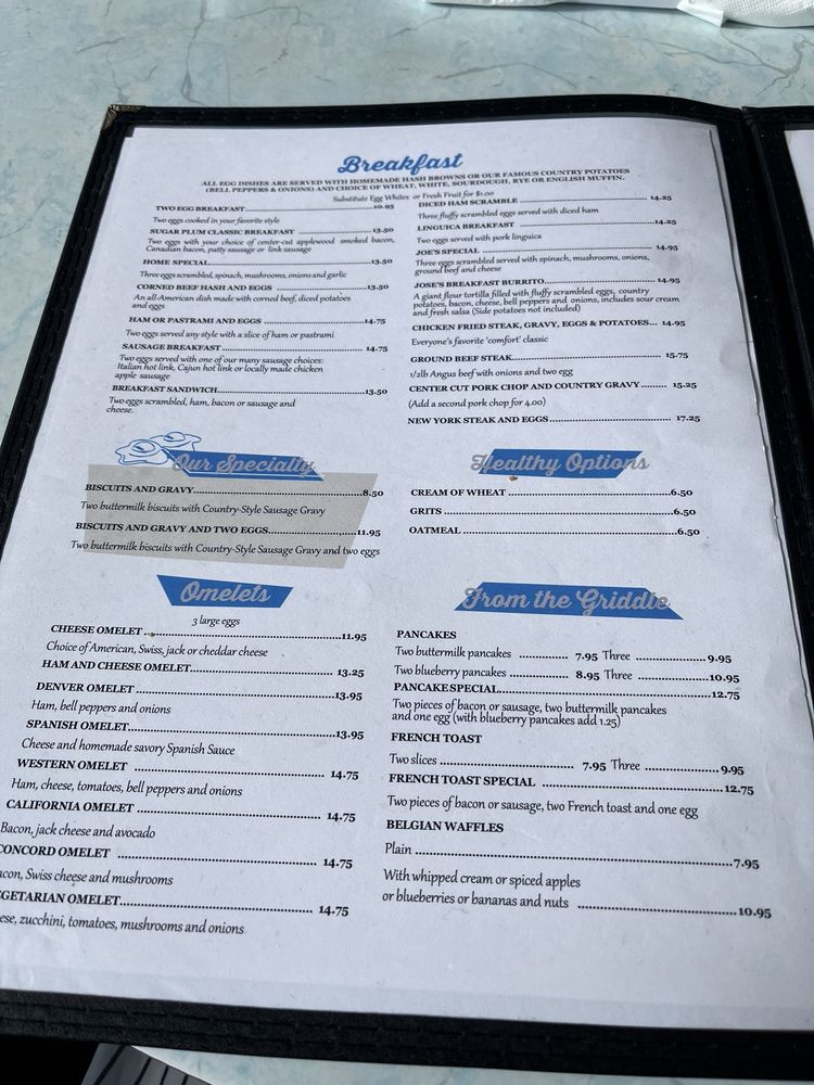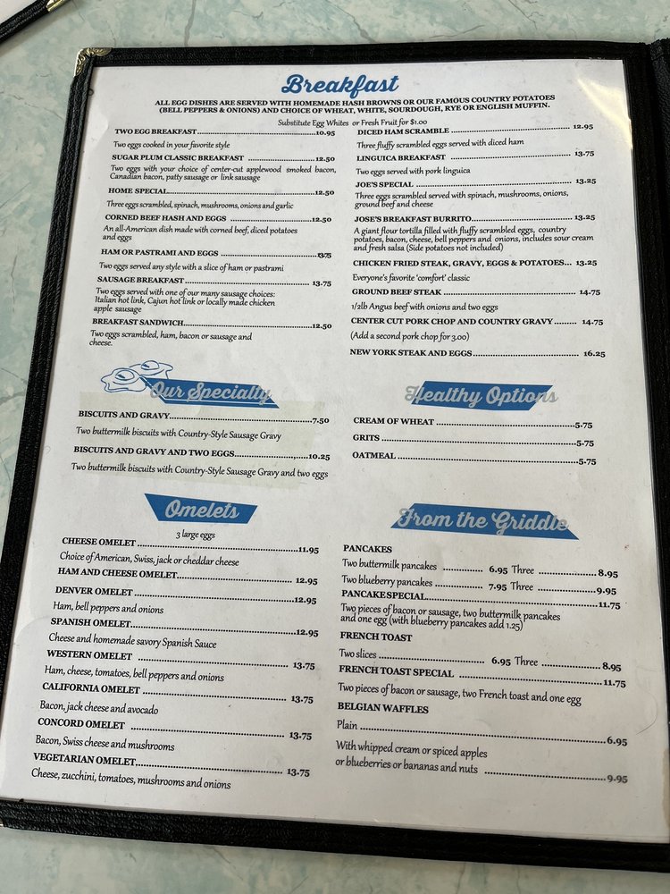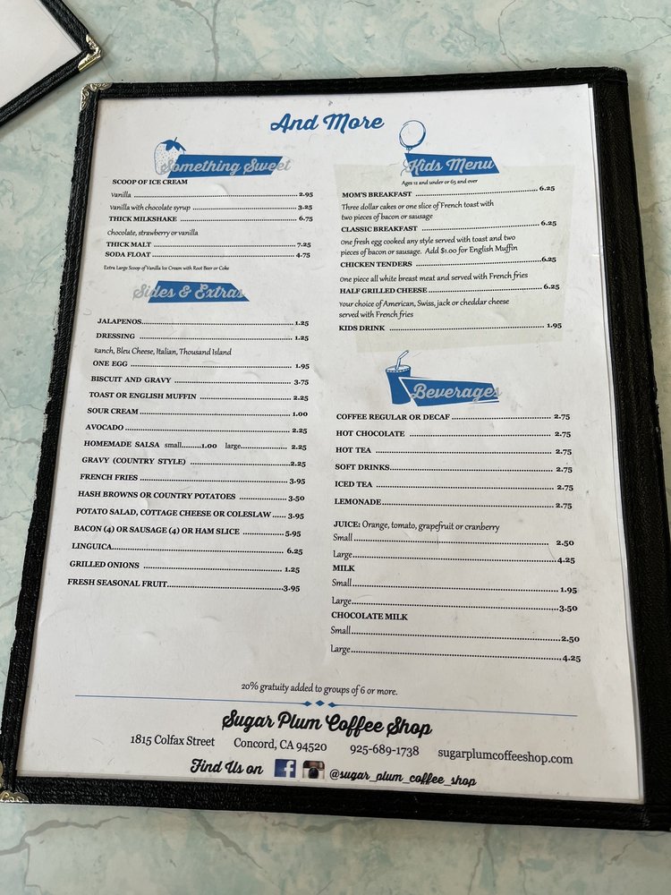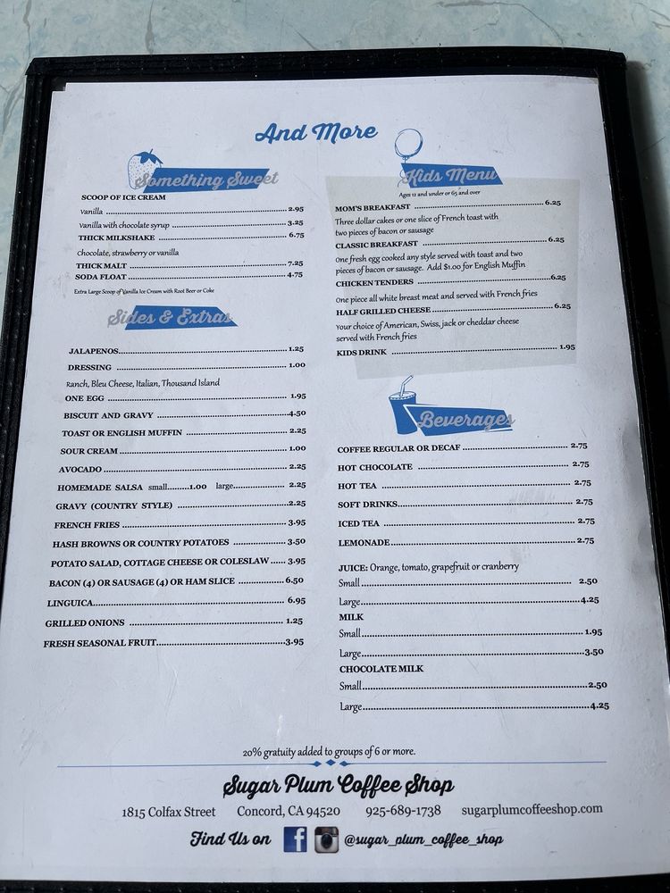 Sugar Plum Coffee Shop in Concord, CA offers a cozy and homely atmosphere with teal-colored walls, providing a welcoming vibe. The menu boasts dishes like blueberry pancakes made with fresh berries, eggs over-easy, and tender steak with fluffy eggs. The friendly staff ensures quick service, making the dining experience enjoyable. Customers praise the delicious food, such as the chicken fried steak with flavorful gravy and the BLAT sandwich. The restaurant is known for its biscuits and gravy, which stand out for their taste. While the place may appear a bit worn down, the efficient service and flavorful dishes make up for it. Overall, Sugar Plum Coffee Shop is a must-visit spot for a satisfying breakfast or brunch experience with a homey touch.